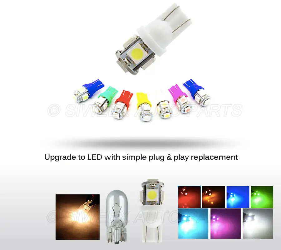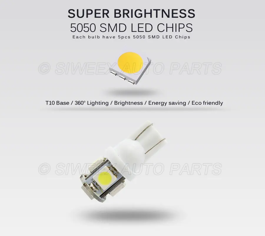 Each T10 LED bulb contains 5 Beautiful High Quality 5050 SMD LEDs , which are much brighter than the stock OEM yellowish tungsten lamps.